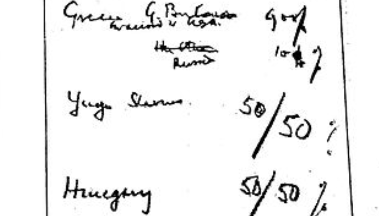 Trong khi chờ thông dịch viên dịch, Churchill viết ra những đề nghị đó chi tiết hơn trên nửa tờ giấy và đưa cho Stalin. Theo lời của Churchill: “Tôi chuyển mảnh giấy nhỏ cho Stalin. Ông ta cũng vừa nghe xong lời dịch. Có một khoảng im lặng ngắn. Sau đó, Stalin lấy cây bút chì màu xanh của mình và đánh một dấu lớn trên nó, và chuyển lại cho tôi. Tất cả đã được giải quyết trong thời gian không quá lâu. Sau đó là một khoảng lặng dài. Tờ giấy và cây bút chì nằm ở giữa bàn.”