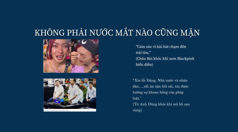 Hai sự kiện “chuyến bay giải cứu” và ‘concert BLACKPINK’ có một hiện tượng giống nhau là khóc nhưng hoàn toàn mang ý nghĩa khác nhau. Các cháu khóc khi nghe Blackpink hát vì đam mê âm nhạc và các cán bộ tham nhũng khóc “xin lỗi đảng” chỉ để nhẹ tội.